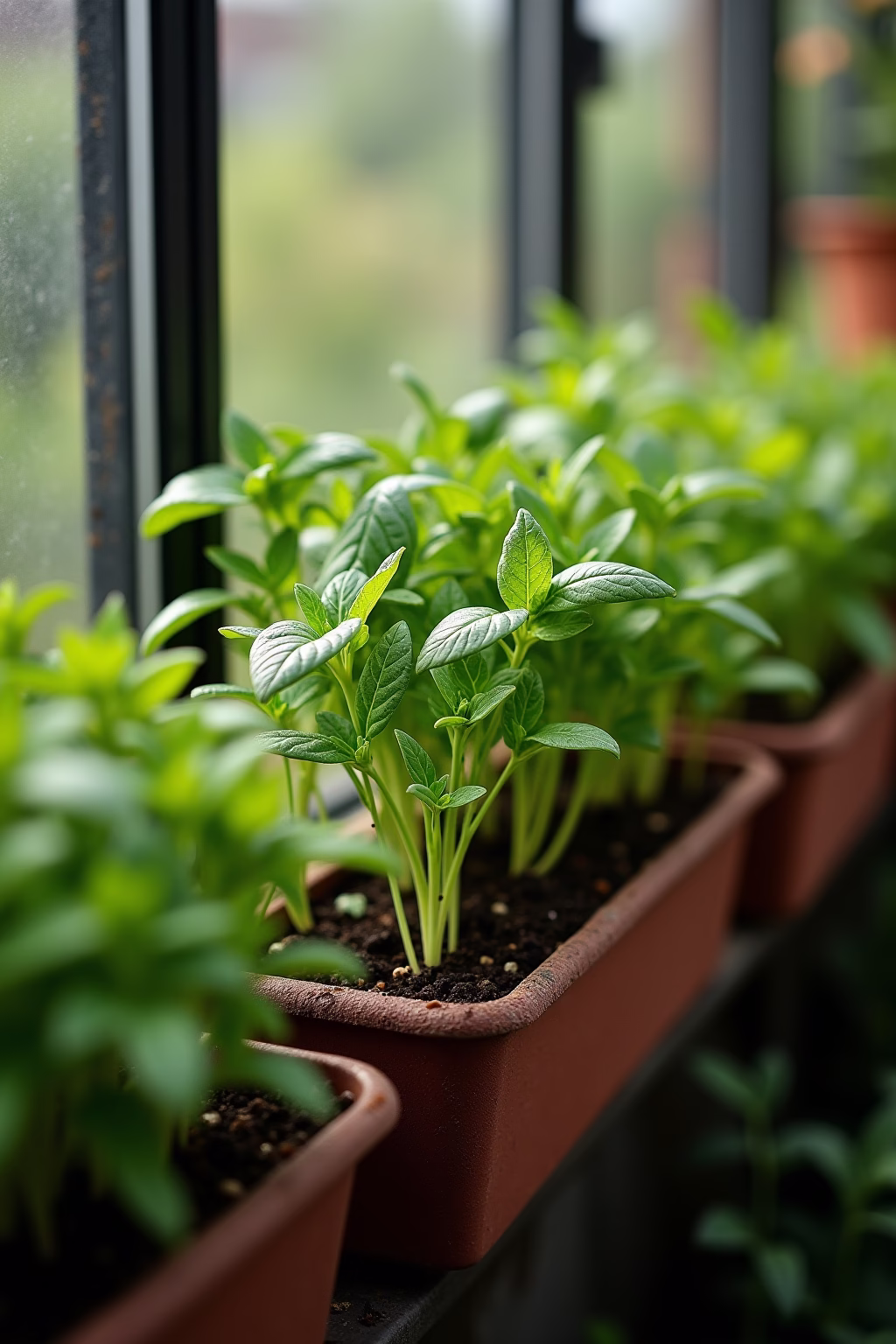 Beste Pflanzen für Dachrinnen-Gewächshäuser: Kräuter (Basilikum, Schnittlauch), Blattsalate, Radieschen und niedrig wachsende Blumen.