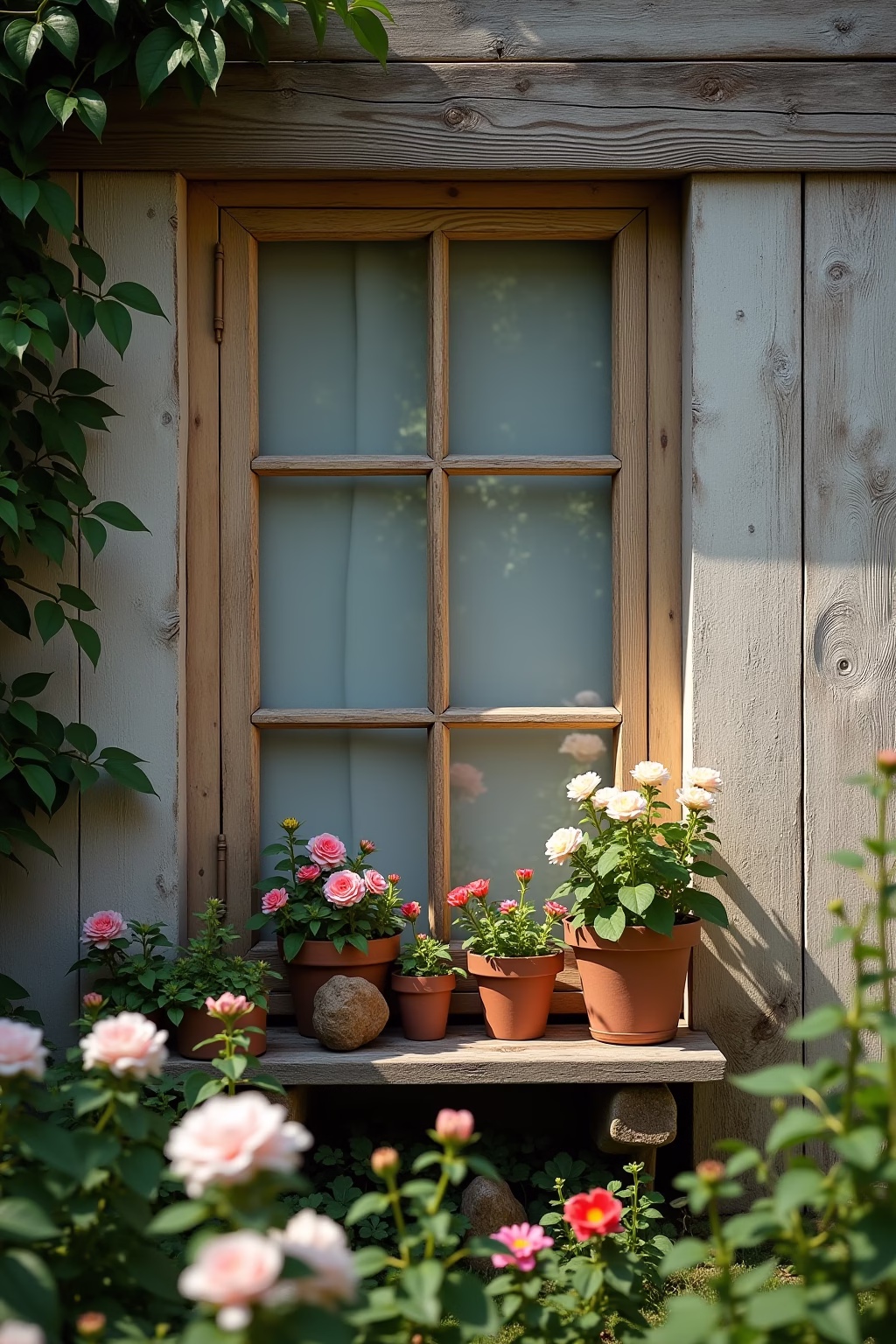 - Alte Fenster verleihen dem Garten authentischen Vintage-Charme und historische Tiefe.