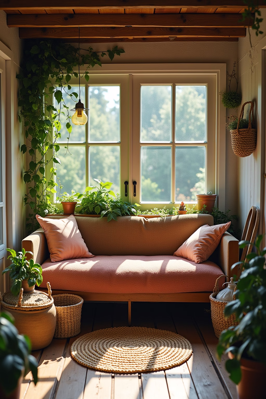 Kleine Sitzecken optimal nutzen: Multifunktionale Möbel mit Stauraum wählen und vertikale Flächen für Pflanzen einbeziehen.