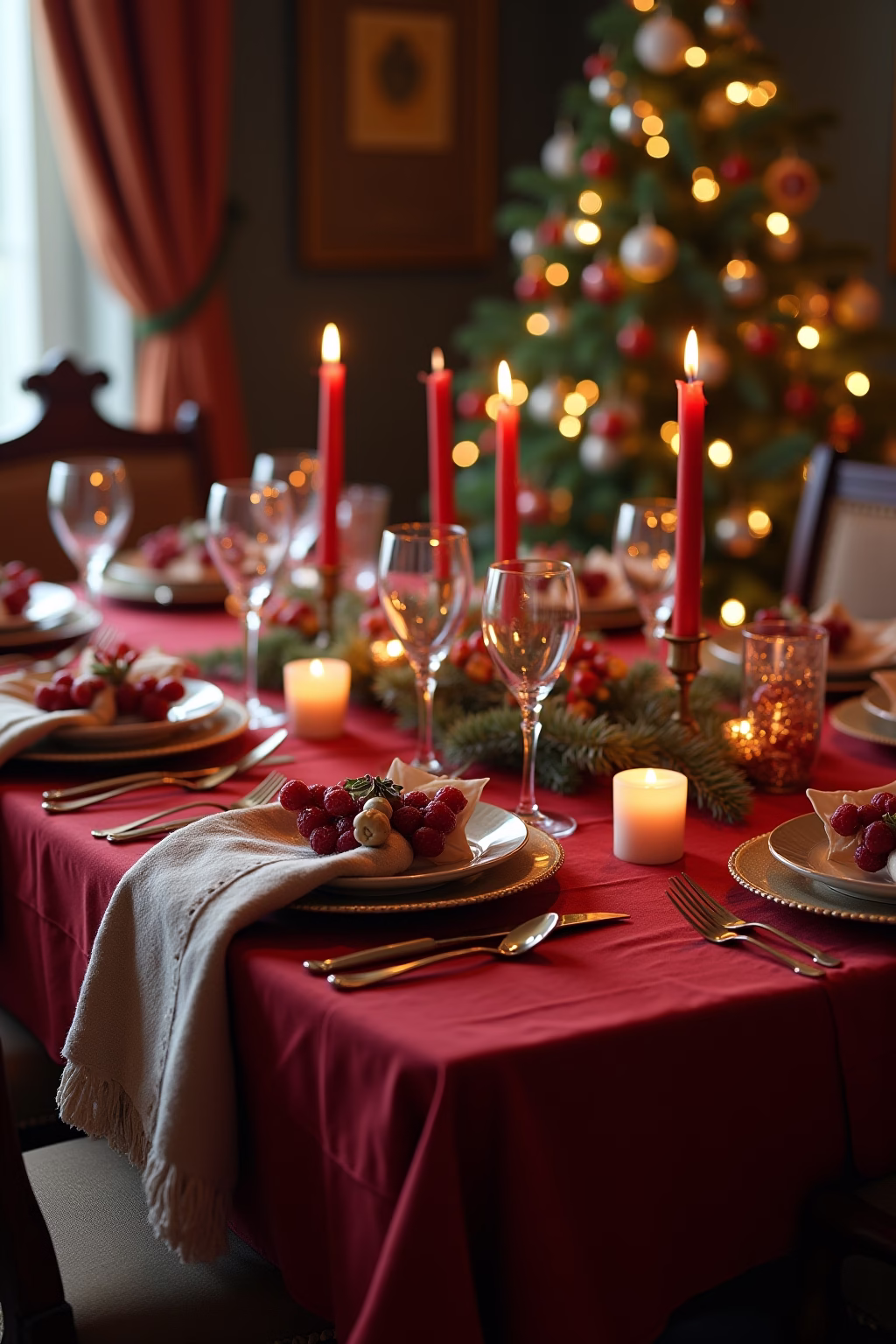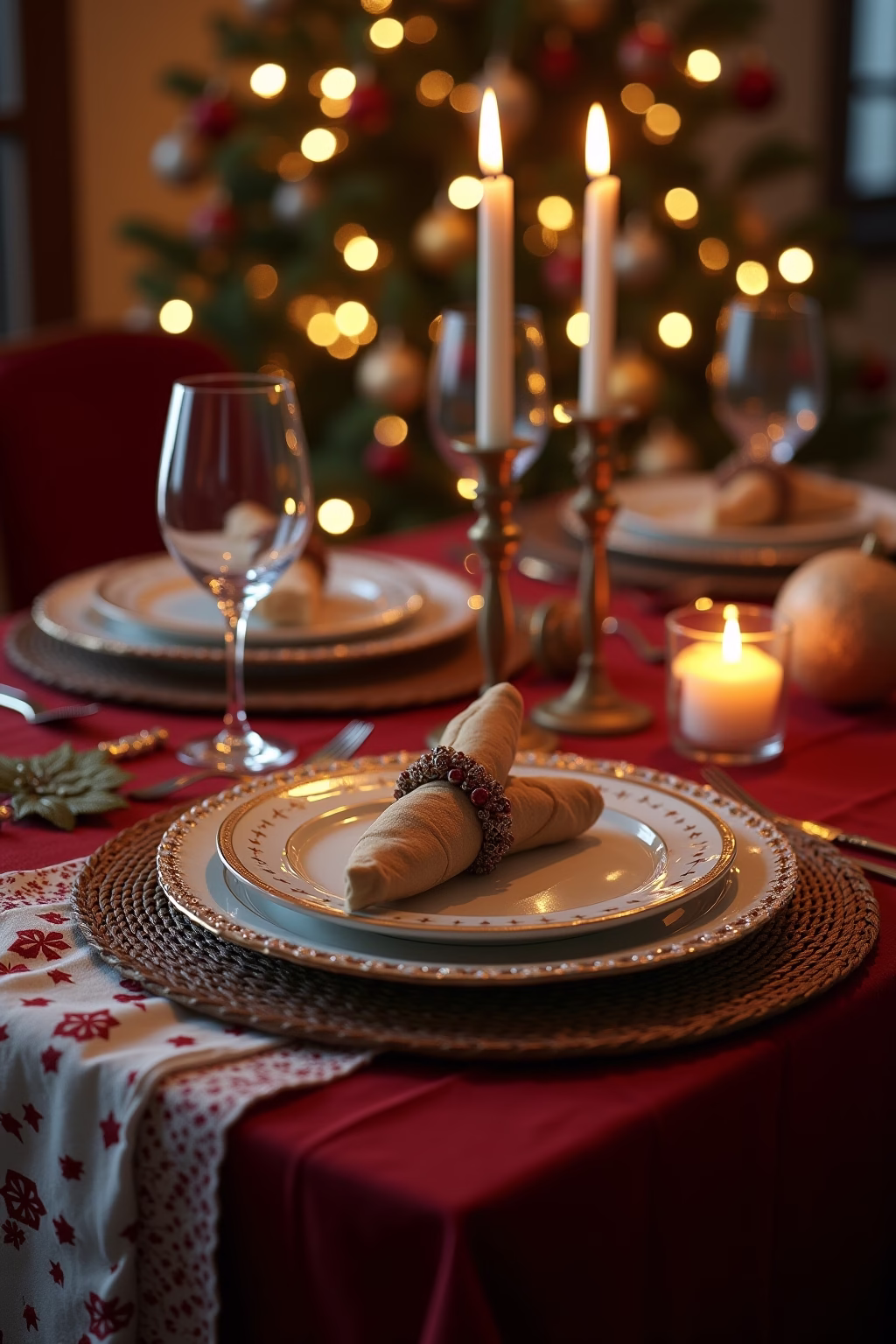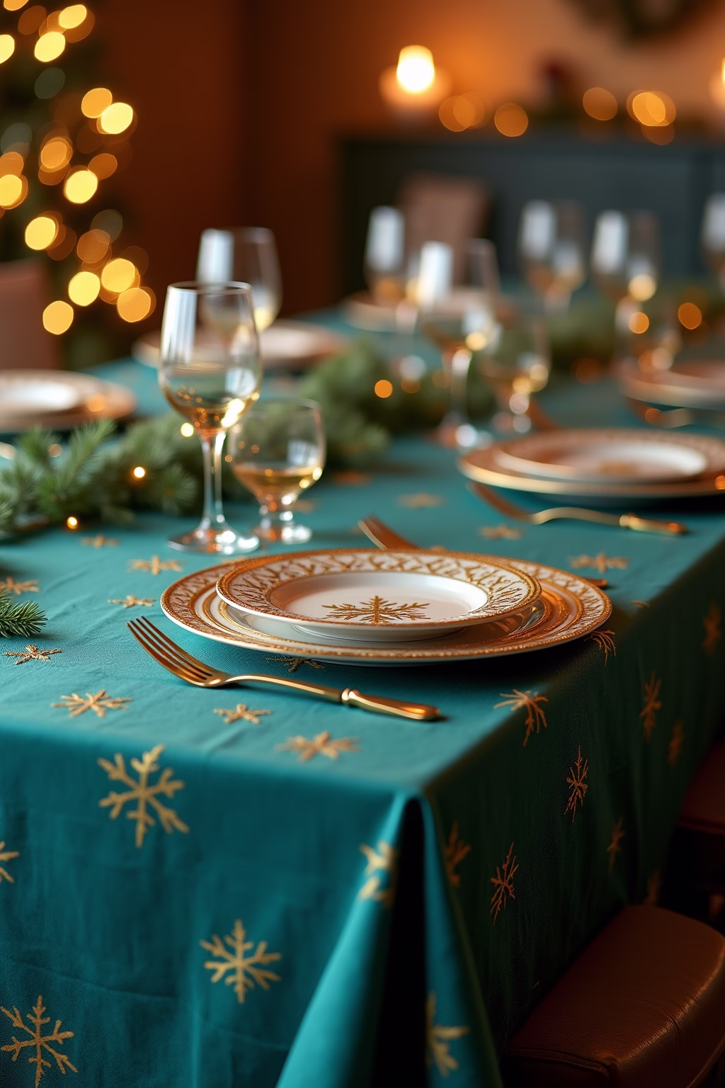 Materialwahl: Metallische Akzente auf der Tischdecke reflektieren das Kerzenlicht und verstärken die festliche Atmosphäre.