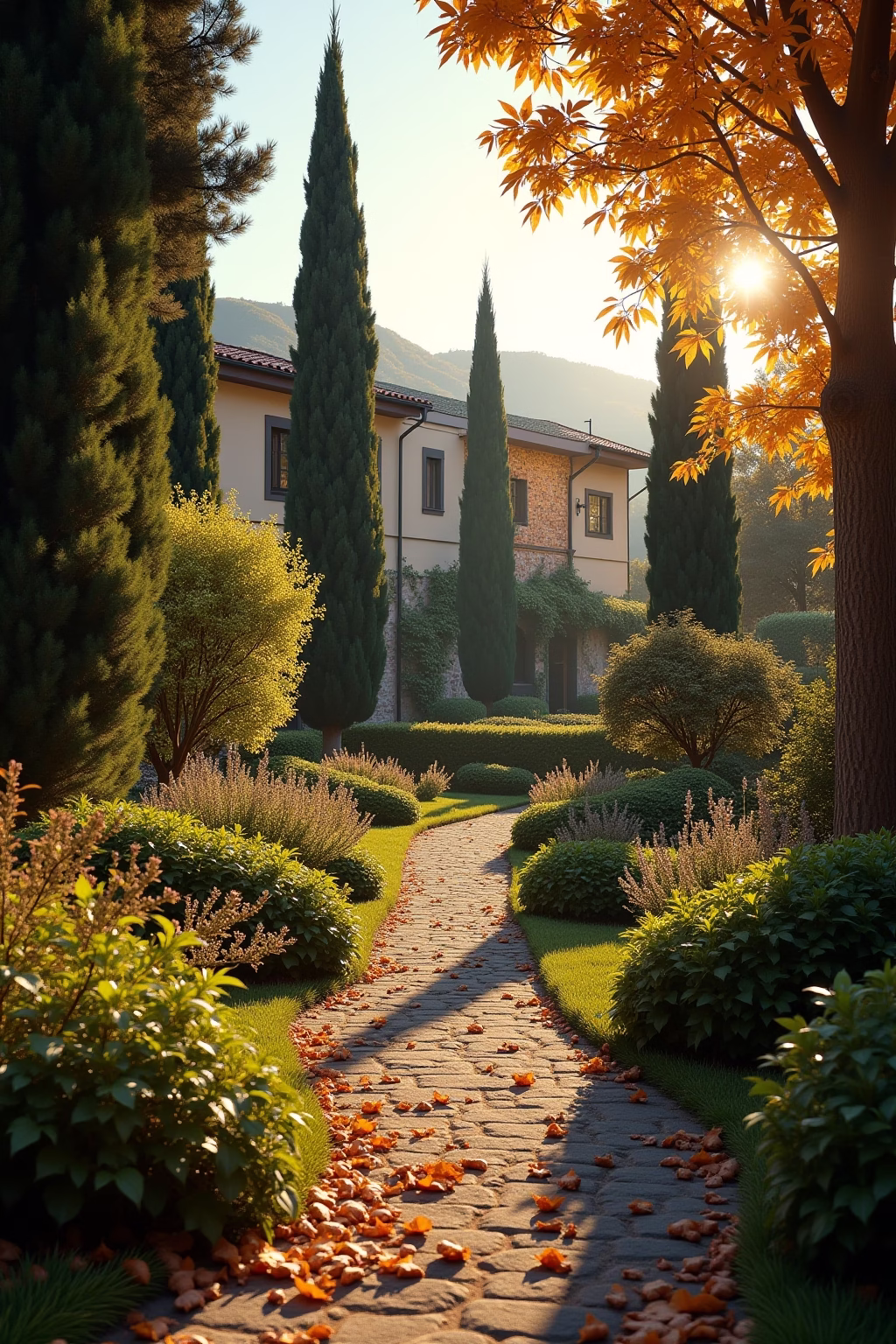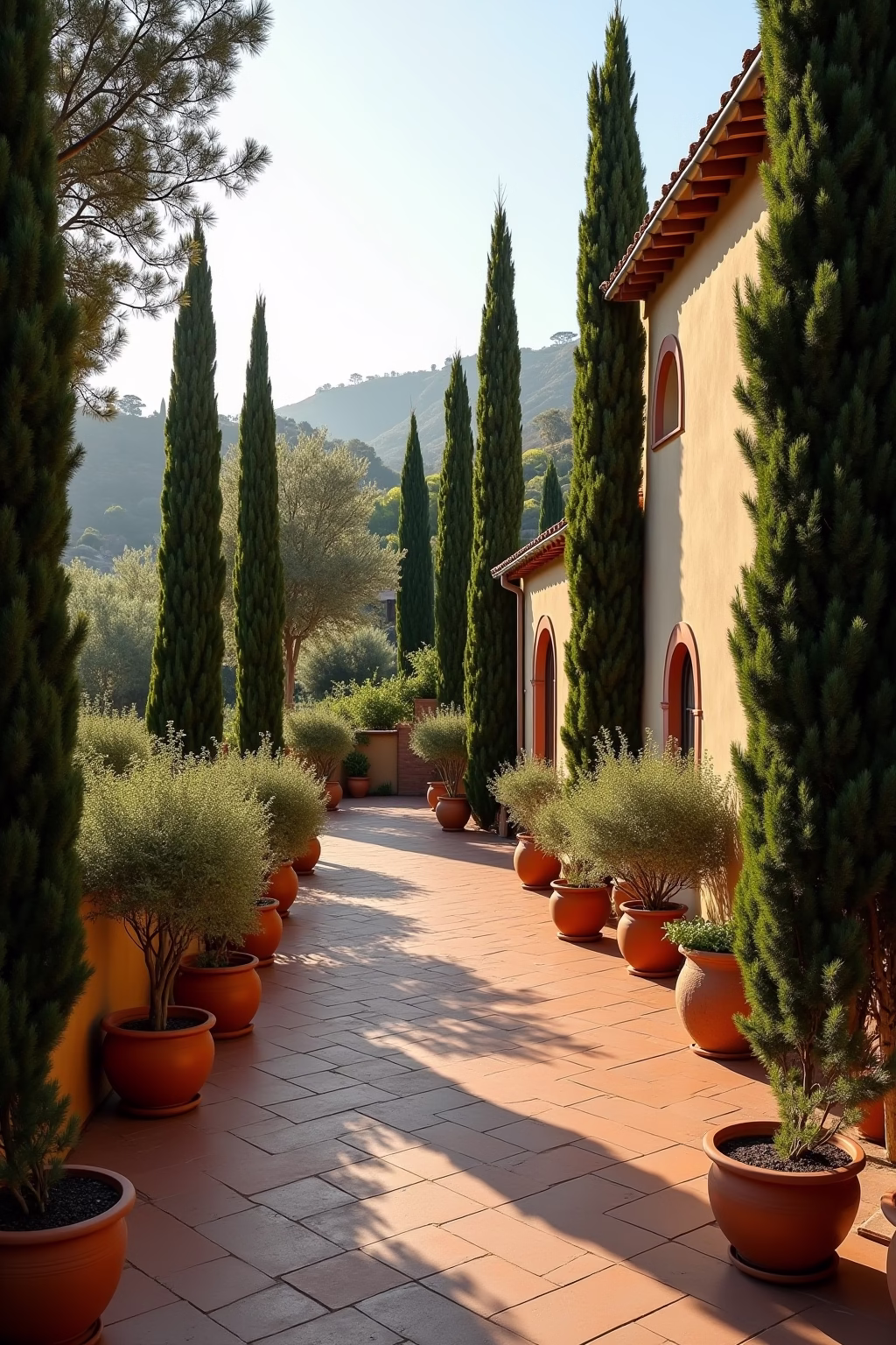- Immergrüne Gehölze wie Zypressen und Olivenbäume als strukturgebende Elemente