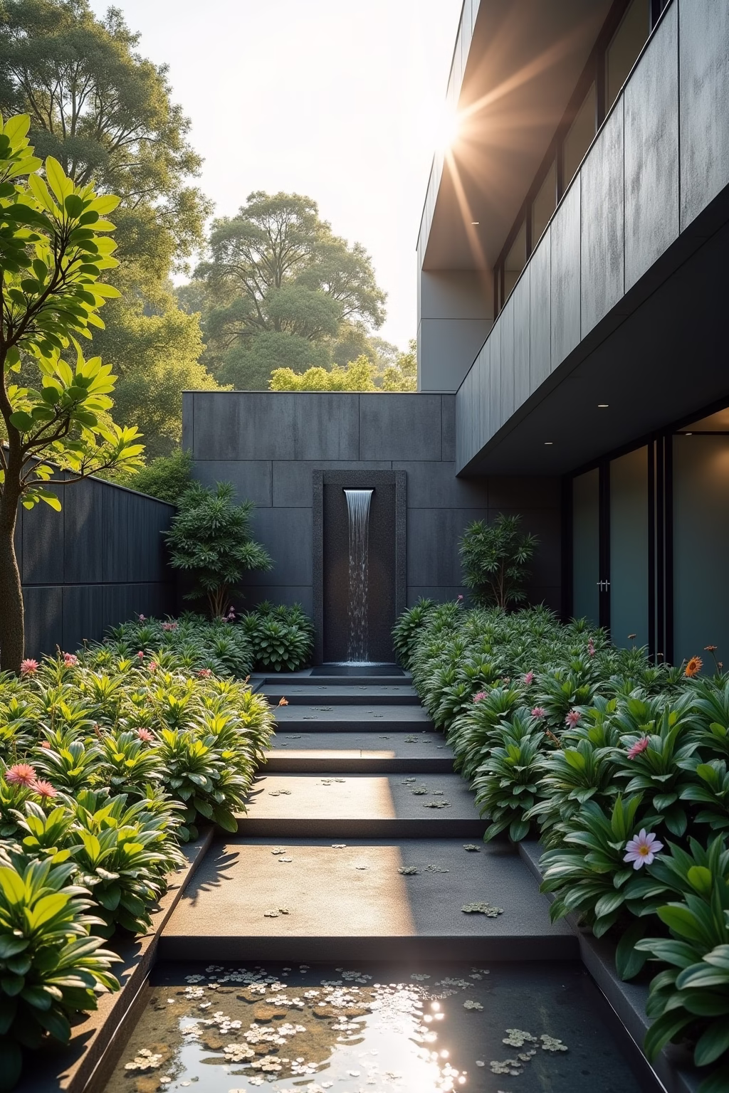 Minimalistische Materialien wie schwarzer Schiefer oder Edelstahl verleihen Gartenwasserfällen eine zeitgemäße Ästhetik.