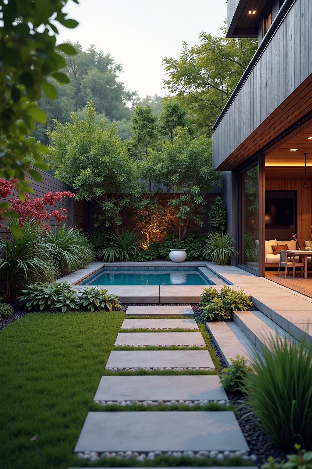 Die durchdachte Einbindung in die Gartenlandschaft mit Pflanzenelementen und passenden Materialien schafft eine natürliche Wohlfühlatmosphäre.