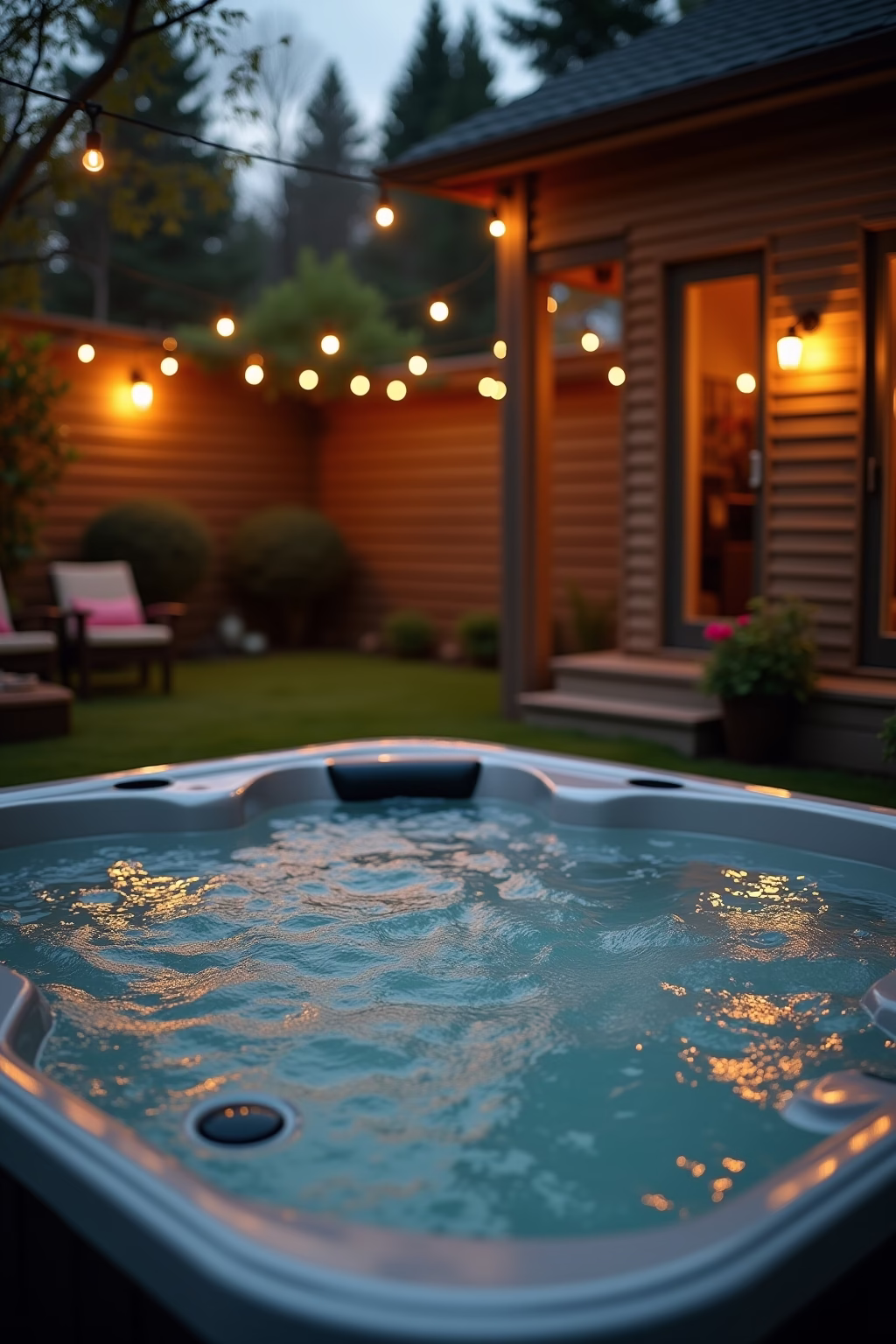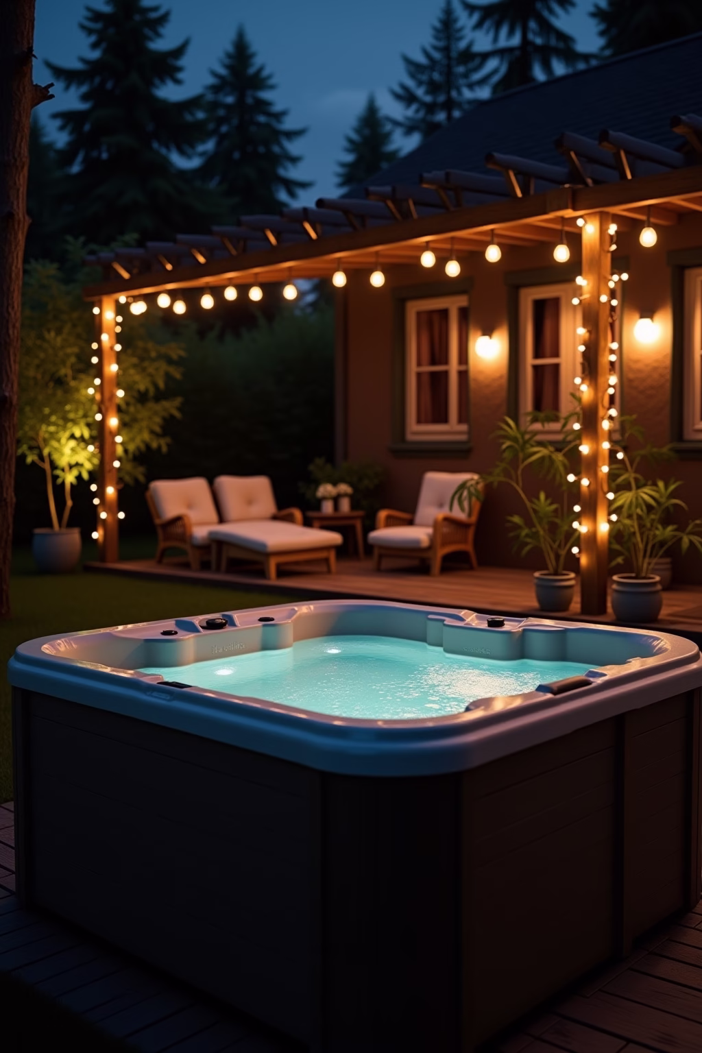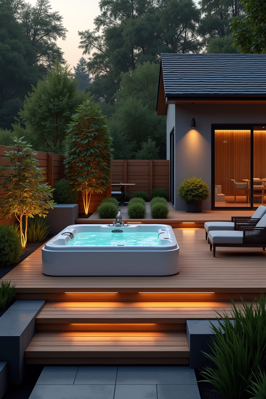 Die harmonische Integration eines Sprudelbeckens erfordert durchdachte Gestaltungskonzepte. Eine Einbettung in ein Holzdeck schafft einen nahtlosen Übergang zur Umgebung und bietet gleichzeitig praktische Ablageflächen. Umgebende Pflanzbeete mit Gräsern, niedrigen Sträuchern oder Bambuspflanzen schaffen einen natürlichen Rahmen. Besonders stilvoll wirkt ein Jacuzzi in einer gesenkten Lounge-Area mit passenden Outdoormöbeln. Kies- oder Steinwege, die zum Badebecken führen, betonen dessen Rolle als Garten-Highlight. Für Abendstunden sorgen indirekte Beleuchtungselemente für Atmosphäre – etwa Solarleuchten entlang des Weges oder wasserfeste LED-Streifen unter der Einfassung. Bei moderner Gartenarchitektur passen geradlinige Einfassungen, in natürlich gestalteten Gärten wirken organische Formen harmonischer.